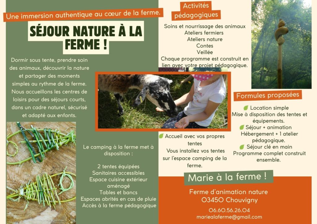 Dormir sous tente, cuisiner ensemble en plein air, prendre soin des animaux, découvrir le potager et partager des moments simples au rythme de la ferme.